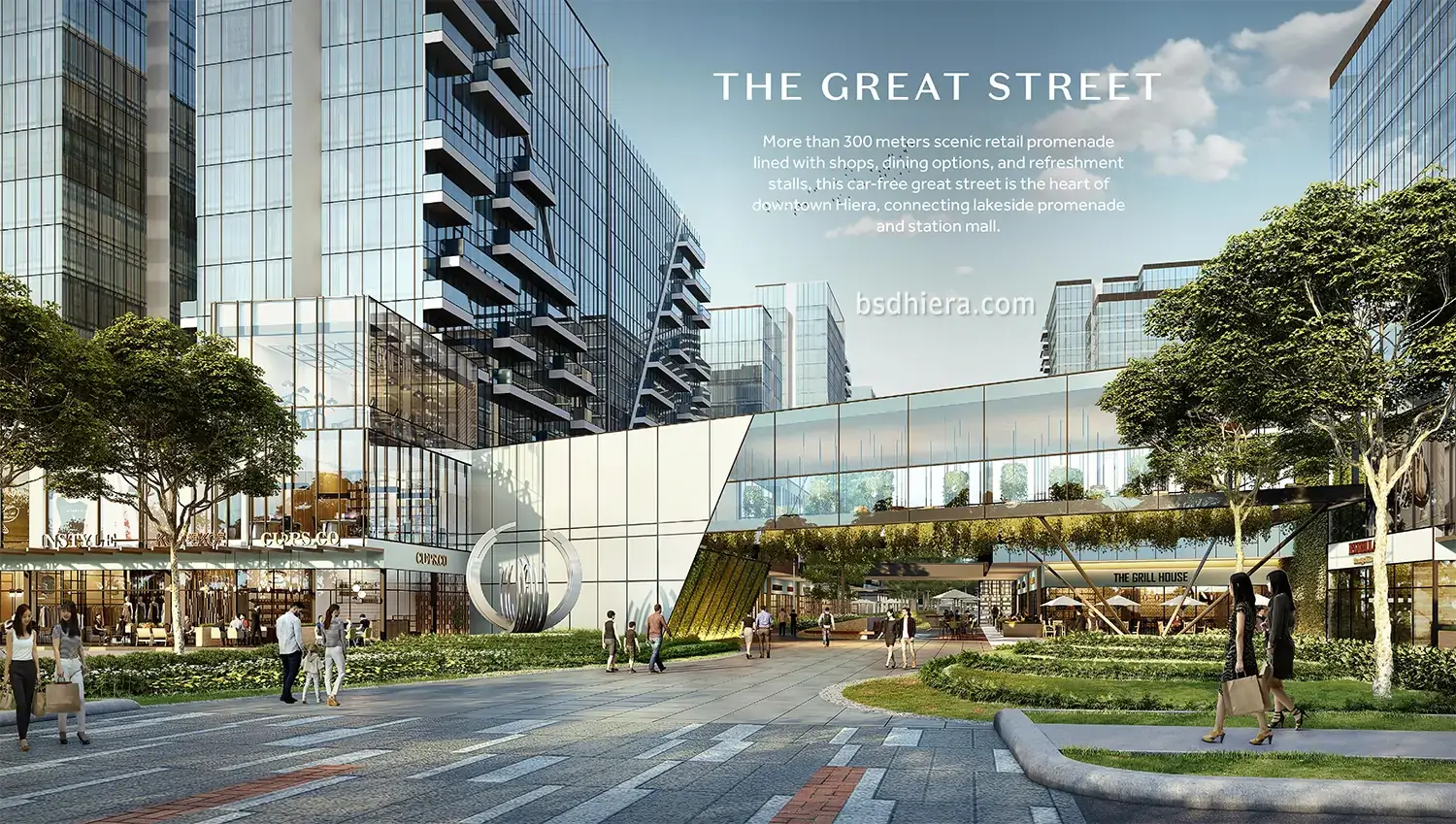Gambar master plan Hiera BSD mencakup 108 ha mixed use development terlihat lebih jelas. Mulai dari (7) Flyover to CBD BSD memberikan kemudahan akses keluar dan masuk yang langsung disugguhkan dengan pemandangan (9) Waterfront. Ke-depan terdapat (10) Great Street sepanjang 300 m scenic retail promenade lengkap dengan pertokoan, tempat makan, kios-kios yang bebas dari kendaraan bermotor; merupakan pusat downtown Hiera yang menghubungkan lakeside promenade dengan mall & stasiun Jatake (8).